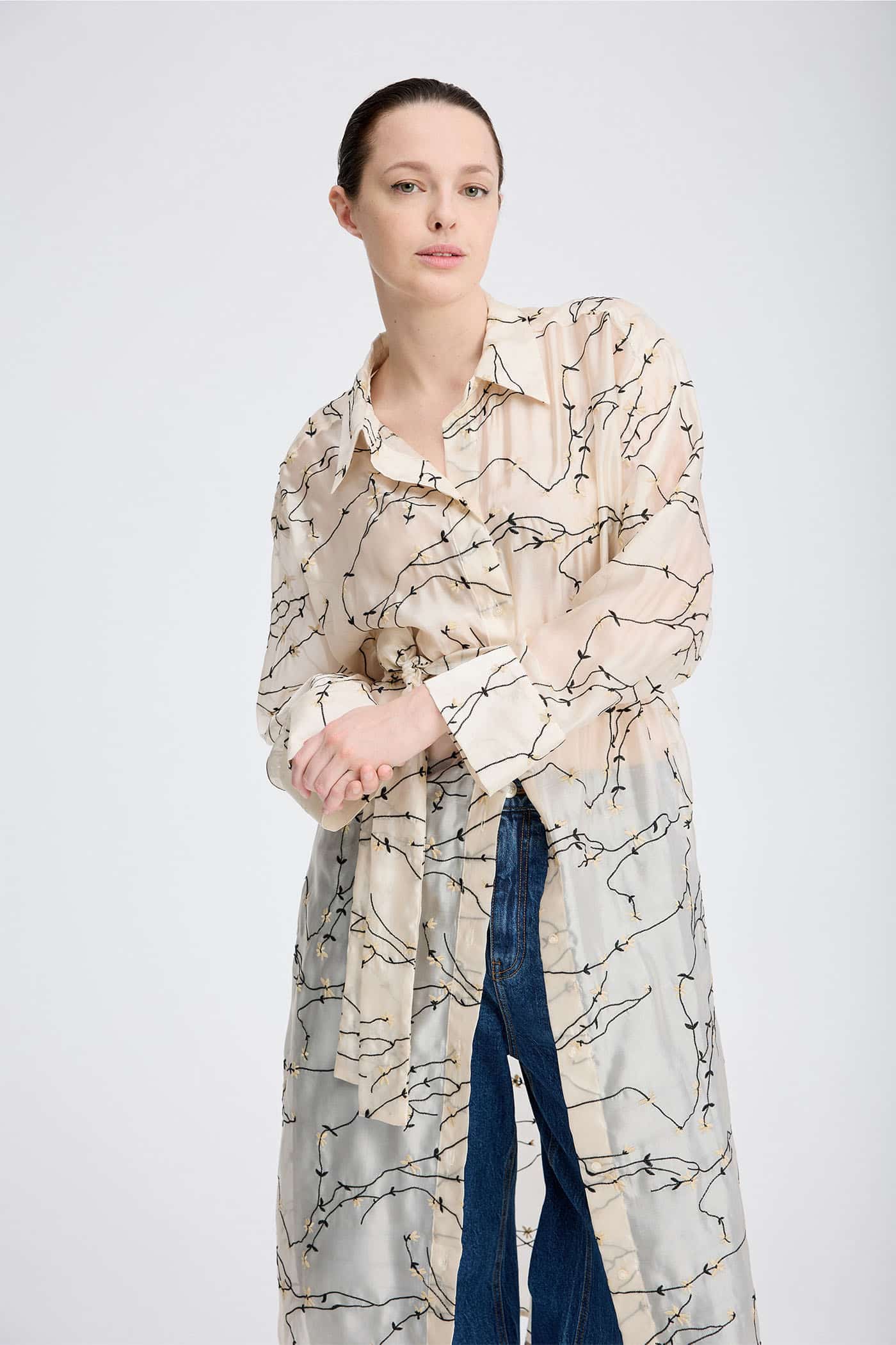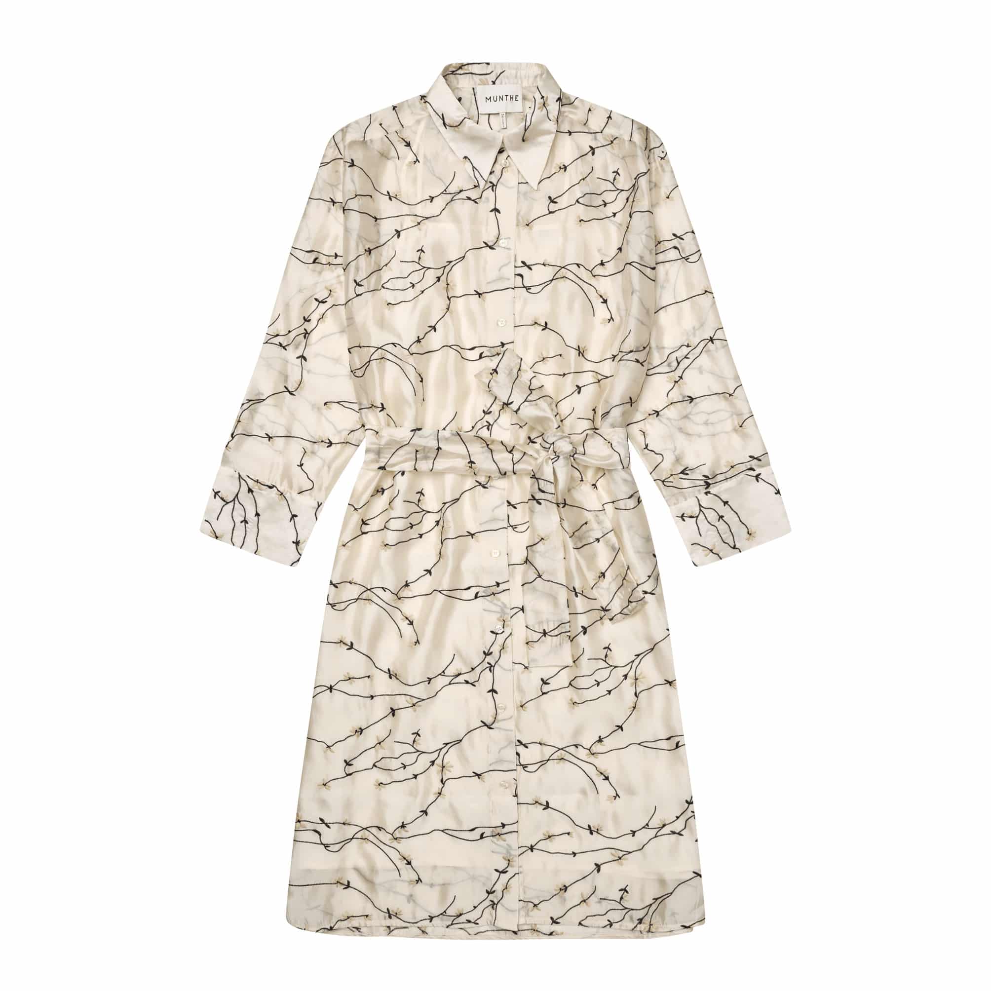 The Pryor Dress is a shirt dress with beautiful floral embroidery, designed with an elegant tie belt at the waist. The dress can be buttoned up and styled both open and closed.